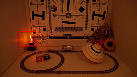 Пусть читателя не смущает уведенная в красноту картинка — виной тому лампы накаливания, меняющие свою температуру вместе с изменением потребляемой мощности, а также близкое их расположение к объективу камеры и находящимся в кадре объектам. До освещенности в 5 люкс включительно автоматика камеры компенсирует нехватку света не только открытием диафрагмы и увеличением чувствительности, но и снижением выдержки. В результате такого вмешательства видеозапись, имеющая частоту 50 прогрессивных кадров в секунду, будет иметь кадры-дубли, повторяющие друг друга. По этой причине снимать на автоматических настройках в условиях слабой освещенности категорически не рекомендуется. Разрешающую способность камеры визуально можно оценить как имеющую 850 условных ТВ-линий по горизонтали.