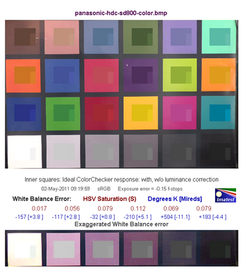 Средняя строчка цифр показывает нам численную оценку ошибки баланса белого в единицах цветового пространства HSV. Так, цифры красного цвета обозначают ошибку по координате S — saturation (насыщенность), цифры синего цвета — в градусах Кельвина [Миредах (Mireds)]. При значении S < 0,02 (речь идет об ошибке по координате S в HSV), ошибка практически незаметна, а при ошибке S > 0,10 она видна, особенно на нейтральных полях большой яркости.
