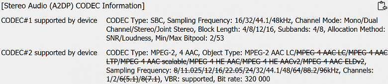 Основных кодеков два — базовый SBC и чуть более продвинутый AAC. Максимальное значение параметра Bitpool для SBC установлено на уровне 53 — немного выше, чем в рекомендованном профиле High Quality (51). Предельный битрейт AAC выставлен на максимальные 320 кбит/с. Настройки вполне адекватные — оба кодека работают на пределе своих возможностей. Также заявлена поддержка LC3+ в режиме до 24 бит / 96 кГц, но пока ни одна из используемых утилит не готова подтвердить его наличие. Тем не менее, его поддержке можно только порадоваться — это хороший задел на светлое будущее, в котором многие устройства-источники обзаведутся его поддержкой.