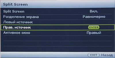 Есть цифровое увеличение с возможностью сдвига области увеличения. Кнопка BLANK временно выключает проекцию (можно задать на какой срок), а кнопка FREEZE переводит проектор в режим стоп-кадра. Параметр Настройка нерабочей области определяет величину обрезки краев изображения (сопровождаемое увеличением до области проекции). В проекторе имеется функция картинка-в-картинке (PIP) и разделения экрана (Split Screen) на две области с разными источниками изображения.