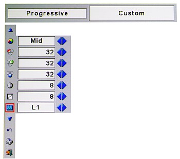 Можно скорректировать изображение, изменяя значения параметров контрастности, яркости, насыщенности (недоступно при VGA- и DVI-подключении), оттенка (только при NTSC-сигнале), цветовой температуры (XLow, Low, Mid и High), интенсивности красного, зеленого и синего цветов, контурной резкости и гамма-кривой. В случае чересстрочных видеорежимов 480i и 576i параметр Progressive отвечает за работу функции деинтерлейсинга (три значения - Off, L1 и L2).