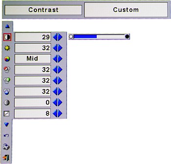 Экранное меню — это горизонтальная полоска с иконками для выбора раздела, вертикальная полоска для выбора параметра и несколько дополнительных окон. Навигация по меню — с помощью курсорных кнопок на пульте или на корпусе проектора. Пользоваться этим меню очень неудобно. Во-первых, приходится отгадывать, чему соответствует та или иная иконка (окошко с подписью к иконке не особенно помогает — см. во-вторых). Во-вторых, из-за перпендикулярного расположения глаза все время бегают от вертикальной линейки к горизонтальной и в угол с легендой — через некоторое время это начинает утомлять. В-третьих, страницы иногда приходится перелистывать, а для этого необходимо нажать на синие треугольные иконки. В-четвертых, при изменении параметров, влияющих на изображение, меню находится на экране, осложняя оценку происходящих изменений и т. д. и т. п. Радует только одно — грамотная и понятная русификация.