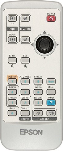 В проекторе есть функция дистанционной мыши: если проектор подключен к компьютеру кабелем USB и джойстик пульта не задействован под другие функции, то им можно перемещать курсор мыши (только в четырех направлениях), а две кнопки пульта работают как левая и правая кнопки мыши, при этом еще две кнопки пульта позволяют удаленно перелистывать слайды презентации. Питается пульт от двух AAA батареек.