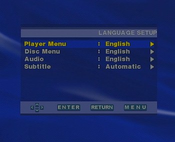 Экранное меню плеера поделено на два подменю. Первое вызывается кнопкой INFO, и посвящено навигации по диску, выбору аудиодорожек, субтитров и настройке моделирования объемного звучания с помощью стереоколонок.