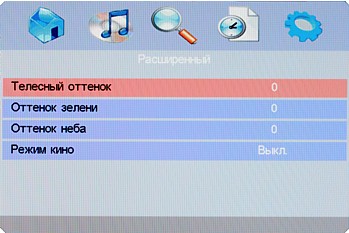Перейдя на страницу Расширенный, можно откорректировать телесные оттенки, интенсивность зеленого и синего цветов, и включить продвинутый режим деинтерлейсинга. Заводские наборы настроек хранятся в трех предустановленных профилях, еще один профиль предназначен для хранения пользовательского набора. Выбираются профили кнопкой PICTURE пульта. Текущие значения настроек автоматически запоминаются для каждого типа источника видеосигнала.