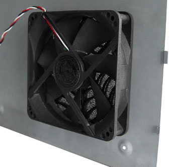 Так как корпус музыкального центра не рассчитан на размещение в нем дополнительных компонентов, то пришлось задуматься о дополнительной вентиляции. Для этого, помимо вентиляционного отверстия, на задней стенке корпуса был установлен 12 мм кулер, нагнетающий воздух в корпус, и сделано дополнительное отверстие на боковой стенке (слева), рядом с жестким диском.
