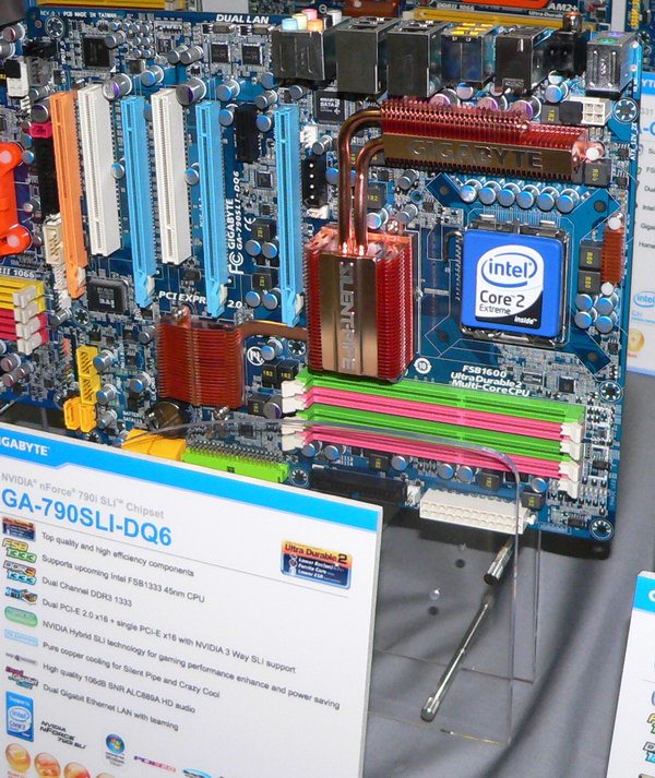 Что касается платы на чипсете G45, готовящемся к выпуску в аналогичные с P45 сроки, то она тоже демонстрировалась вживую, ну а какие-либо инновации вокруг этого чипсета едва ли возможны. В нынешнем (и готовящемся) конкурентном окружении, его уделом будут, скорее всего, скромные офисные машинки.
