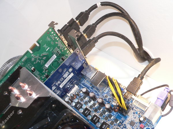 Для усложнения «правил игры» была поставлена задача подключать мониторы только по цифровому каналу, через HDMI. С задачей подключения 4 таких мониторов справилась плата TF8200 A2+ на чипсете GeForce 8200 с внешней видеокартой. Как оказалось, несмотря на то, что из собственных цифровых разъемов (DVI и HDMI) на плате может быть задействован только один, с помощью дополнительной PCIEx1 карты из чипсета можно «вытянуть» второй цифровой канал. На полученном сверхшироком рабочем столе крутилось видео, и даже если половина окна плеера оказывалась на экране, подключенном к видеокарте, а вторая половина — на экране — от интегрированного видео, никаких заминок и торможений не возникало.