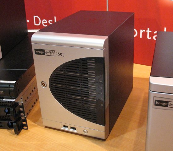 Известный производитель решений для хранения данных, компания Iomega представила несколько NAS, ориентированных на разные целевые группы. Для дома предлагается использовать StorCenter Network Hard Drive и StorCenter Wireless Network Storage. Первая модель существует в двух модификациях — для одного SATA диска и для двух. В последнем случае возможно объединение дисков в массивы RAID0 или RAID1. Сетевой интерфейс представлен Gigabit Ethernet. Для расширения предусмотрены два порта USB 2.0. Накопители имеют встроенный медиасервер UPnP AV. Старшая модель дополнительно оборудована беспроводным интерфейсом, имеет четыре отсека для жестких дисков и поддерживает RAID5. Для офисной работы рекомендуется использовать модели StorCenter Pro NAS 150d и StorCenter Pro NAS 250d. Первая из них имеет четыре корзины для жестких дисков с горячей заменой, гигабитный сетевой интерфейс, четыре порта USB с поддержкой сетевых принтеров и основана на ядре PowerPC и ОС Linux. 250d имеет внутри себя полноценный компьютер с процессором Intel Celeron D, а в качестве операционной системы — Microsoft Windows Storage Server 2003. Отметим, что у нее только три отсека для жестких дисков, а в качестве дополнительного встроенного накопителя может быть использован Iomega REV. Старшие модификации этой версии могут иметь два гигабитных порта.