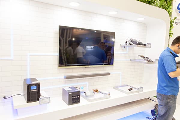 Компания в этом году немного изменила свою традиционную концепцию экспозиции. Дело в том, что FSP известна во всем мире прежде всего как производитель блоков питания для ПК. Однако спектр продукции FSP существенно шире, и именно этот факт компания хотела подчеркнуть на выставке — а потому центральное место в экспозиции занимали отнюдь не блоки питания для ПК. К примеру, мало кто знает, что в каждом третьем продаваемом в мире телевизоре используются блоки питания FSP. И в качестве наглядной демонстрации этого факта компания продемонстрировала свои блоки питания для телевизоров, NAS-устройств и другой техники.