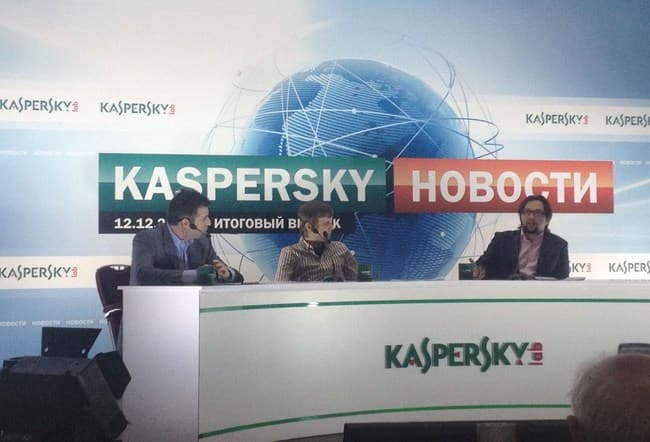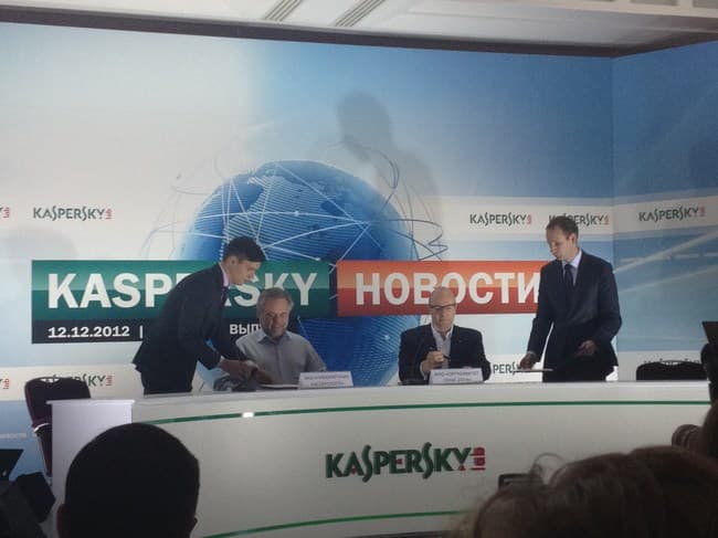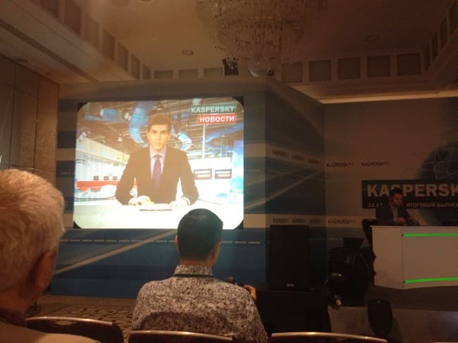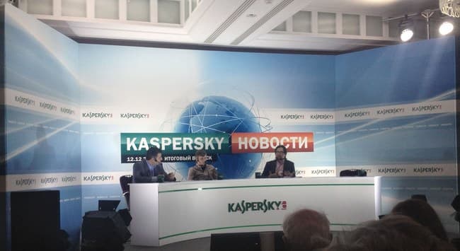 12 декабря «Лаборатория Касперского» провела очередное пресс-мероприятие, посвященное итогам 2012 года и прогнозам на год 2013-й. В этот раз креативные ребята из Лаборатории оформили конференцию в виде выпуска новостей, а сцена была оформлена под новостную студию.