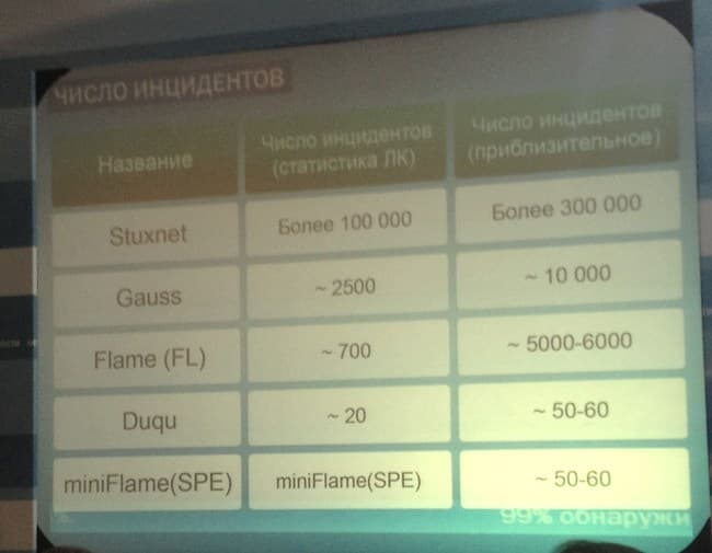 В качестве примеров разрушительной деятельности стоит упомянуть троянец Wiper (название условное, а сам вирус так и не нашли), который полностью уничтожил информацию в компьютерных системах на ряде нефтяных платформ на Ближнем Востоке. Зато в ходе его поисков была обнаружена система для кибершпионажа Flame. Это, по словам Александра Гостева, многофункциональная платформа, имеющая много разных компонентов и способная выполнять самые разнообразные шпионские функции. Еще одной уникальной особенностью Flame стало то, что для распространения он использовал уязвимость в системе шифрования, которая позволила создать подлинный сертификат Microsoft и использовать его для распространения через службу Windows Update. Что интересно — по мнению сотрудников Лаборатории, этот вирус действовал в течение очень долгого времени, нескольких лет, поэтому объем украденной им информации даже сложно себе представить.