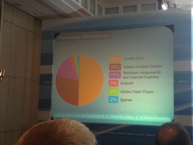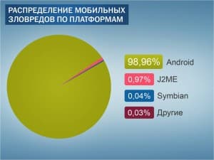 По его словам, атакуют ту систему, которая больше распространена. Если взять данные по всему миру, то Android установлен на 66% смартфонов, iOS — на 23%. Так что Android выглядит гораздо более выгодной целью. Странно, но аргумент о том, что Android — открытая система, да еще и позволяет устанавливать приложения из любого источника, а не только из официального магазина (хотя и он не является гарантией — вредоносные приложения выявляются в нем постоянно) был упомянут в числе причин только на втором месте. По статистике, приведенной на пресс-конференции, 99% современных мобильных вирусов выходят под Android, 1% — под J2ME и 0,5% — под Symbian.