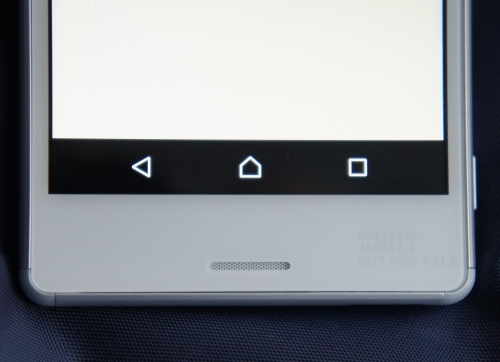 На передней панели сенсорных кнопок нет, кнопки здесь экранные. Внизу под экраном в стекле прорезана щель, симметричная верхней, однако стереодинамиков, как у флагманской модели Xperia Z3, здесь нет, а под решеткой внизу скрывается лишь разговорный микрофон.