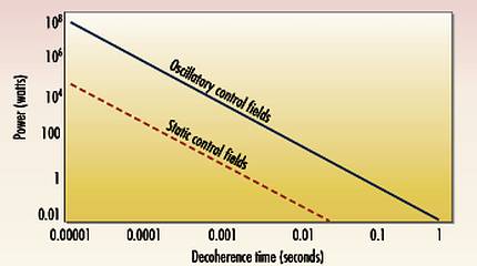 На графике приведена зависимость потребляемой энергии от времени декогерентизации для теоретического квантового чипа, используемого для взлома криптографического кода AES с 1024-разрядным ключом. Из расчетов профессора Университета Арканзаса следует, что даже чипы с временем декогерентизации порядка 10 мкс будут рассеивать более 100 МВт. В то же время, по его расчетам, при времени декогерентизации 1 мс такой квантовый чип будет потреблять около 1 Вт.
