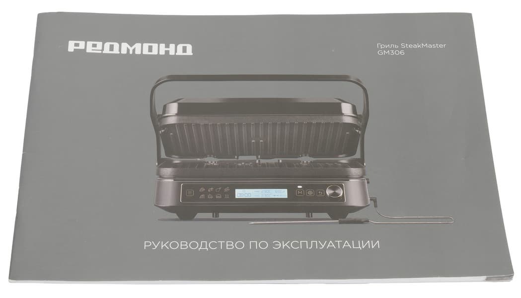Redmond SteakMaster GM306 поставляется в симпатичной крепкой коробке, оформленной в фирменной стилистике бренда. На упаковке представлена информация, изучив которую пользователь сможет составить первое мнение о приборе: его внешнем виде, технических характеристиках и основных преимуществах.
