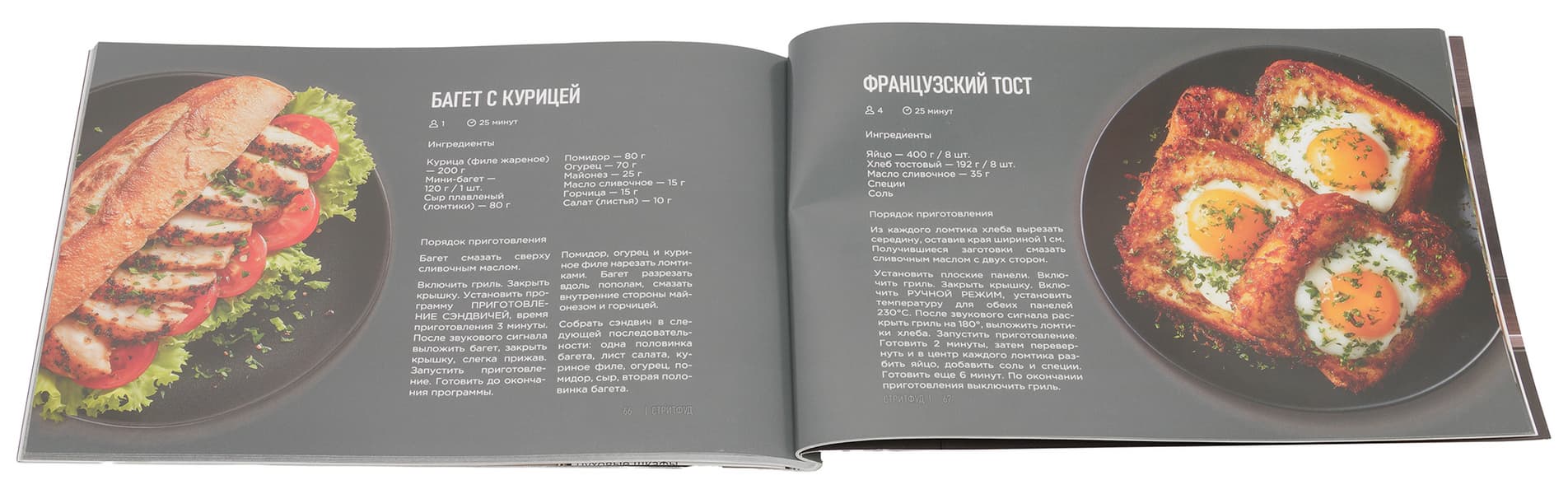 Помимо инструкции в комплект гриля входит красочное издание с массой интересных рецептов. Каждый снабжен подробным описанием процесса приготовления блюда, списком ингредиентов и конечно яркой аппетитной фотографией.