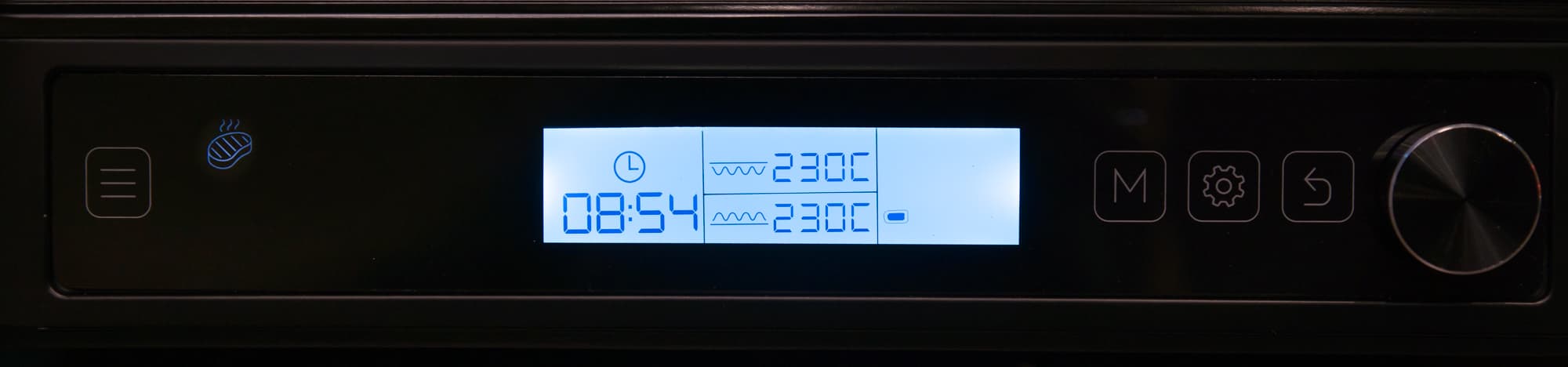 За 10 минут работы обеих панелей при 230 °C гриль потребил 0,225 кВт·ч. За 11 минут работы в режиме Стейк с прожаркой medium rare (с учетом 5-минутного предварительного разогрева) было потрачено 0,3 кВт·ч.