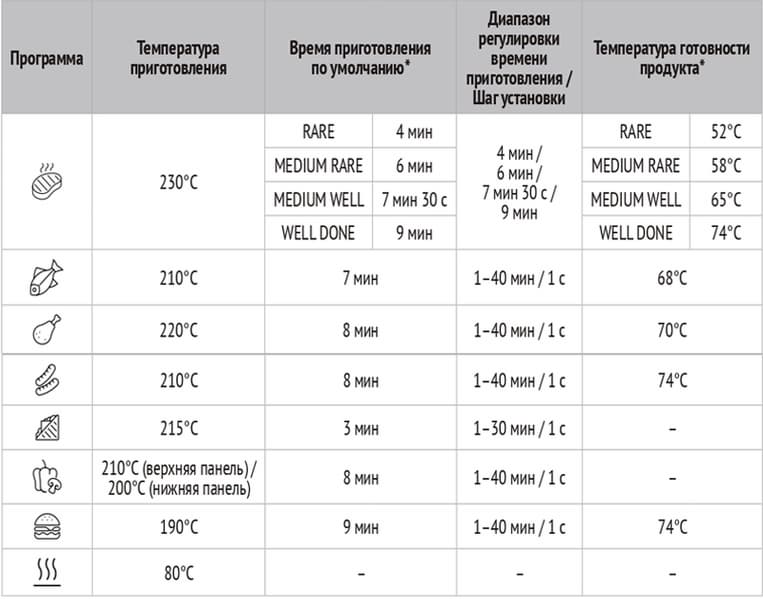 | Стейк | 230 °C | 210—230 °C верхняя панель 220—245 °C нижняя панель |