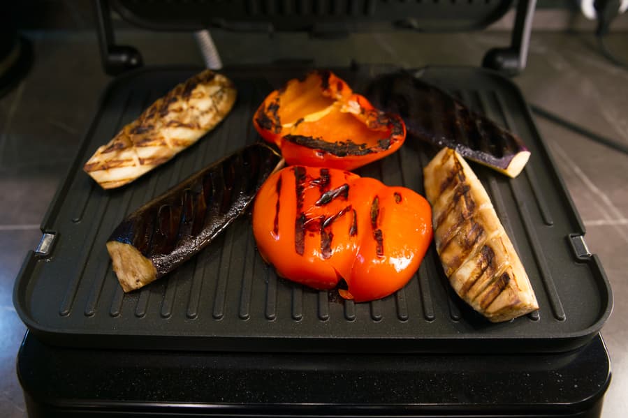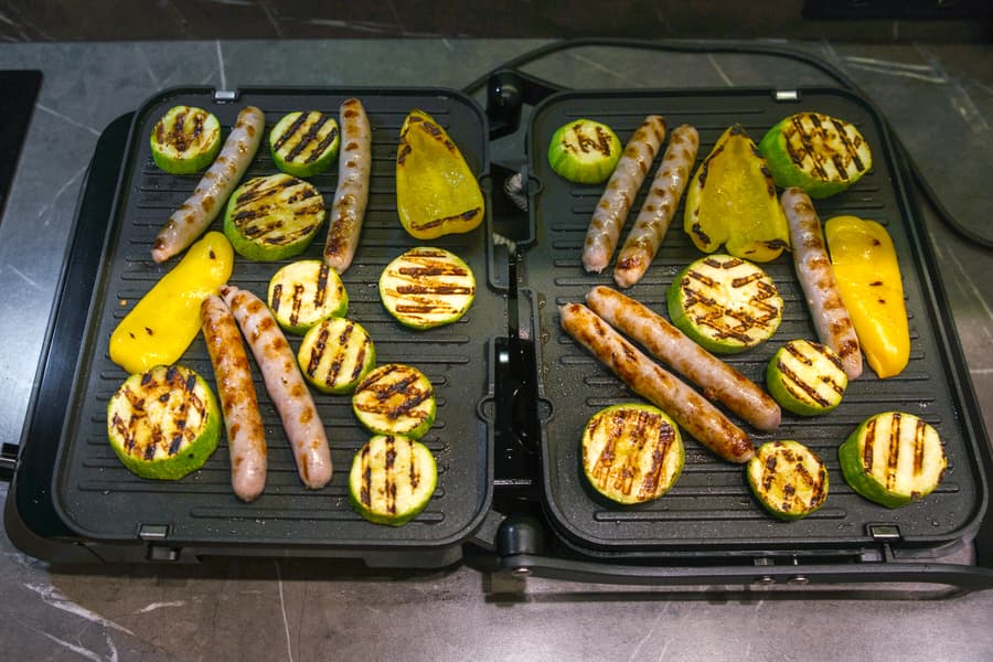 Для проверки качества и скорости обжаривания продуктов на полностью раскрытых панелях мы взяли кабачок, еще один болгарский перец и колбаски.