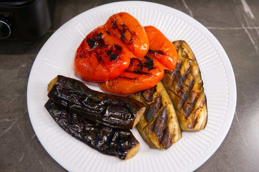 Обжаривание баклажанов и болгарских перцев происходило в режиме Овощи в течение 10 минут. По умолчанию программа задает нагрев верхней панели до 210 °C, а нижней — до 200 °C. Через 5 минут мы оценили промежуточный результат. В целом всё шло хорошо, но хотелось побыстрее и более зажаристую корочку. Решили увеличить температуру до максимальных 230 °C. В автопрограмме это сделать нельзя, поэтому переключились на ручной режим. Еще через 5 минут овощи были готовы.
