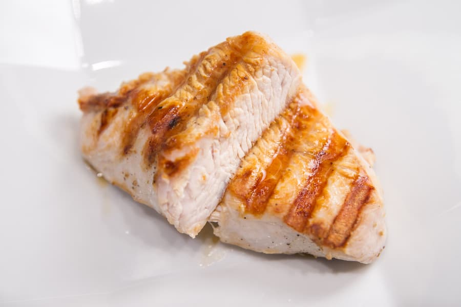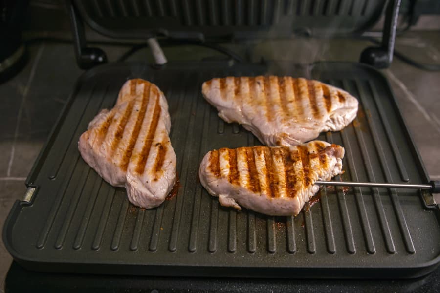 Три крупных куска филе индейки смазали небольшим количеством растительного масла, присыпали солью и выложили на панели гриля, разогретые до 220 °C в режиме Птица. Подключили термощуп к грилю и воткнули его в один из стейков. Неизменяемая температура, по достижении которой гриль автоматически выключается в этом режиме, составляет 70 °C.
