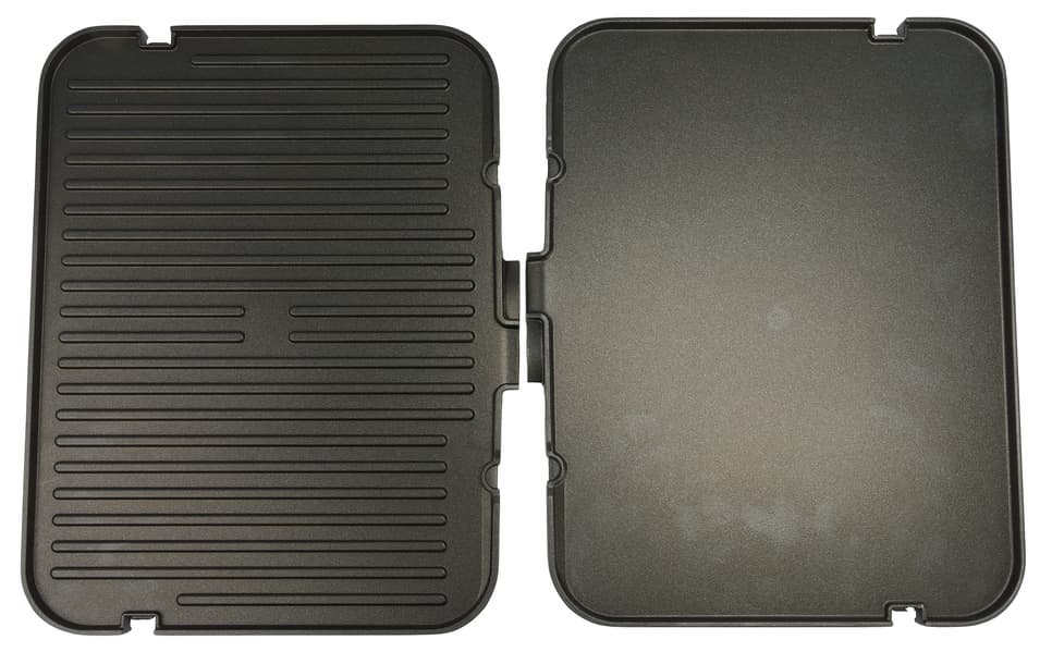 Двусторонние жарочные панели изготовлены из алюминиевого сплава и обработаны антипригарным покрытием. Покрытие нанесено равномерно и не производит впечатление тонкого. Панели идентичны и взаимозаменяемы: любую из них можно установить на крышку или корпус гриля.