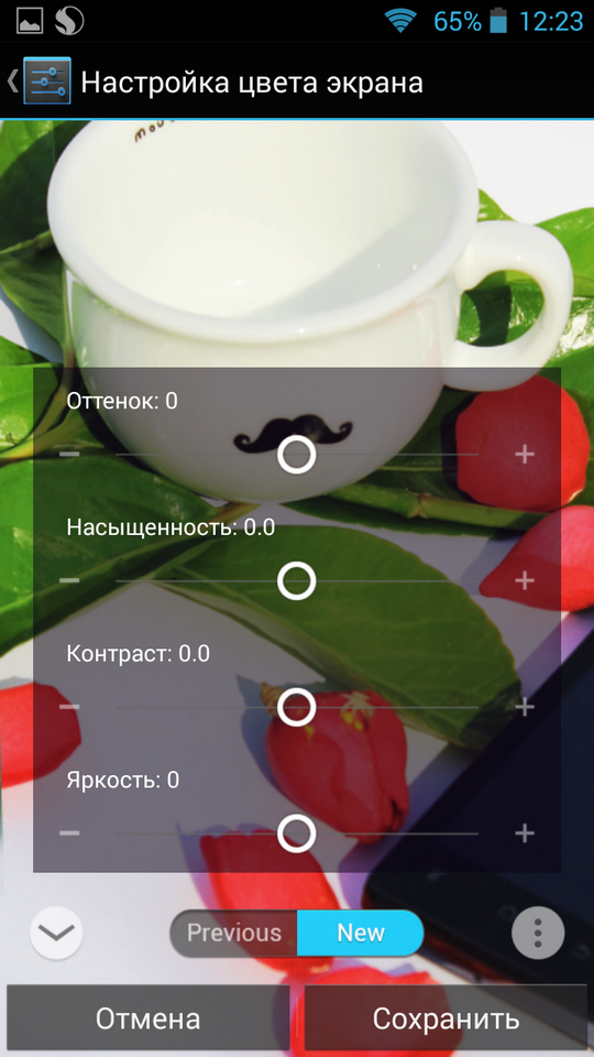 Сложно вспомнить, когда в смартфоне бренда второго эшелона встречалась детальная настройка параметров экрана. Highscreen Boost 2 SE предлагает две «заготовки» – «стандартный» и «яркий». Для любителей более тонкой настройки есть четыре параметра: оттенок, насыщенность, контраст и яркость. Изменения сразу же применяются к текущему тестовому изображению. К сожалению, сохранение пользовательских профилей для последующего выбора из списка недоступно.