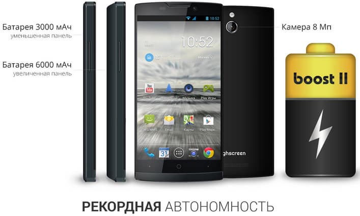 В прошлом году среди некоторых производителей смартфонов вошло в тренд решение одной из главных проблем такого рода устройств – крайне ограниченной автономности. Причем помощь со стороны крупнейших компаний так и не последовала, потребителей «услышали» лишь марки второго эшелона. Highscreen стал первым в России брендом, предложившим «долгоиграющий» смартфон, – Highscreen Boost с огромной батареей на 4 160 мАч. На момент выпуска в феврале 2013 года ни один Android-фон в стране не обладал столь мощным аккумулятором.