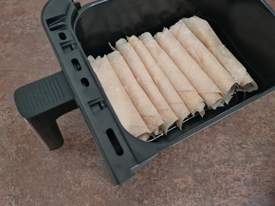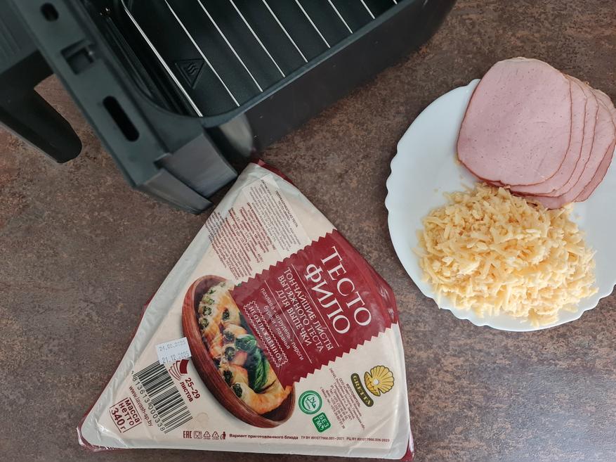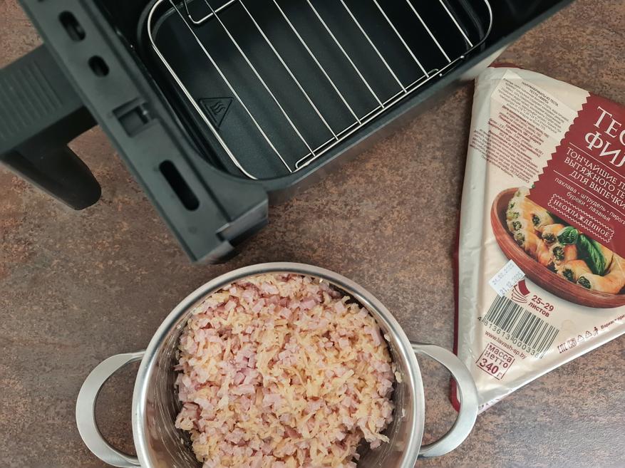 Для рулетиков взяла тонкие листы для выпечки, твердый сыр и копчено-вареное филе свинины. Рулеты разместила на решетке, включила ручной режим: установила температуру 200 °C, таймер на 3 минуты. Этого оказалось недостаточно, добавила еще 3 минуты, чтобы получить ровную румяную корочку без яичной помадки.