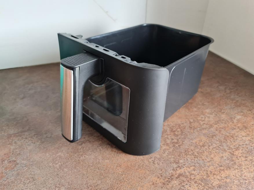 Это довольно крупное устройство, но важно помнить, что перед нами не просто аэрогриль, это комбинированная модель «два в одном» с двумя независимыми электрическими печами в одном корпусе. Каждая из них имеет собственную чашу объемом 5,5 литра с керамическим покрытием и стеклянным смотровым окошком. Через него удобно следить за процессом приготовления, а встроенная подсветка помогает оценить степень готовности без извлечения чаши. Рукоятки у чаш крупные, с хорошим выносом. Это позволяет безопасно извлекать емкости, не касаясь корпуса с горячей поверхностью. Для каждой чаши предусмотрены решетки-панели с силиконовыми уплотнителями по краям, чтобы избежать царапин и износа внутренней поверхности чаш при установке и эксплуатации.