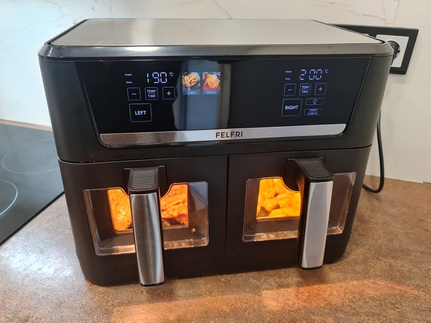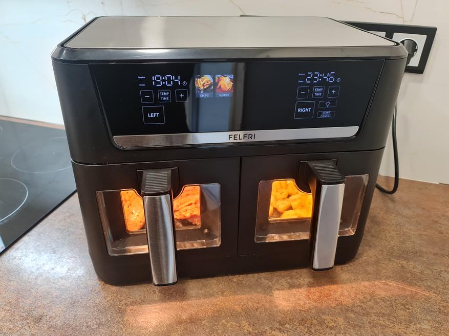Управление интуитивно понятное, сенсорная панель реагирует быстро, все функции логично распределены. Каждая чаша запускается отдельно, и для каждой можно выбрать собственную программу. Всего доступно десять предустановленных режимов, рассчитанных на разные типы блюд — от картофеля фри и курицы до пиццы, рыбы и кексов. Среди доступных режимов: картофель фри, куриные крылышки, целая курица, рыба, стейки, пицца, кексы, креветки, а также режимы гриля и разморозки. Есть также ручной режим, позволяющий самостоятельно задать температуру (от 50 до 200 °C) и время (от 1 минуты до 60 минут).