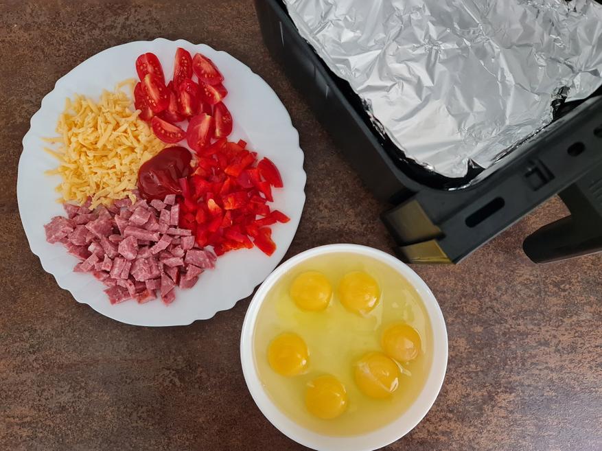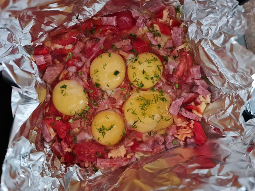 Для яичницы я использовала куриные яйца, сладкий перец, немного помидоров, сервелат, зелень и специи. Ингредиенты привычно выложила на фольгу, установила ручной режим: 190 °C на 15 минут, затем продлила готовку еще на 5 минут. Яичница получилась нежной, овощи пропеклись равномерно.