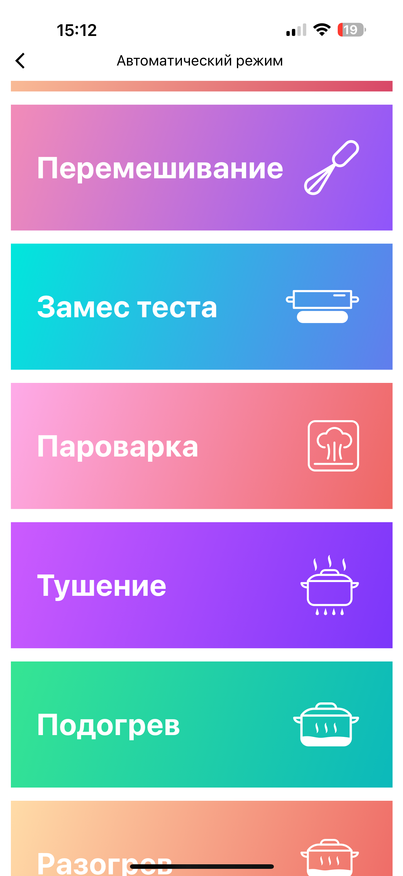В разделе «Автоматический режим» доступны предустановленные программы, включая самоочистку. Среди них: тушение, измельчение, подогрев, лёгкий суп, варка, нарезка, йогурт, обжарка, ризотто, перемешивание, каша, замес теста, каша конджи, пароварка, густой суп, а также очистка и глубокая очистка.
