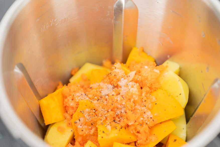 В чашу прибора установил универсальный нож и положил нарезанные на части тыкву вместе с картофеля. Затем добавил овощи, посолил и приправил сушёными специями. Всё это залил водой и накрыл крышкой. Для готовки выбрал автоматический режим «Густой суп». Программа полностью ведёт процесс самостоятельно: сначала нагревает чашу, затем около 20 мин идёт варка. После этого нагрев отключается, а нож начинает поэтапно перемешивать ингредиенты, постепенно повышая скорость. На завершающем шаге суп пюрируется: выполняется несколько циклов измельчения примерно по 5 мин каждый, хотя при желании можно остановить раньше. После завершения добавил немного пармезана и сливок и задал программу перемешивания на 2 минуты для придания сливочности блюду. Результат оказался более чем достойным: суп получился густой, вкусный и с однородной текстурой без кусочков. Подавать блюда рекомендую с сухариками.