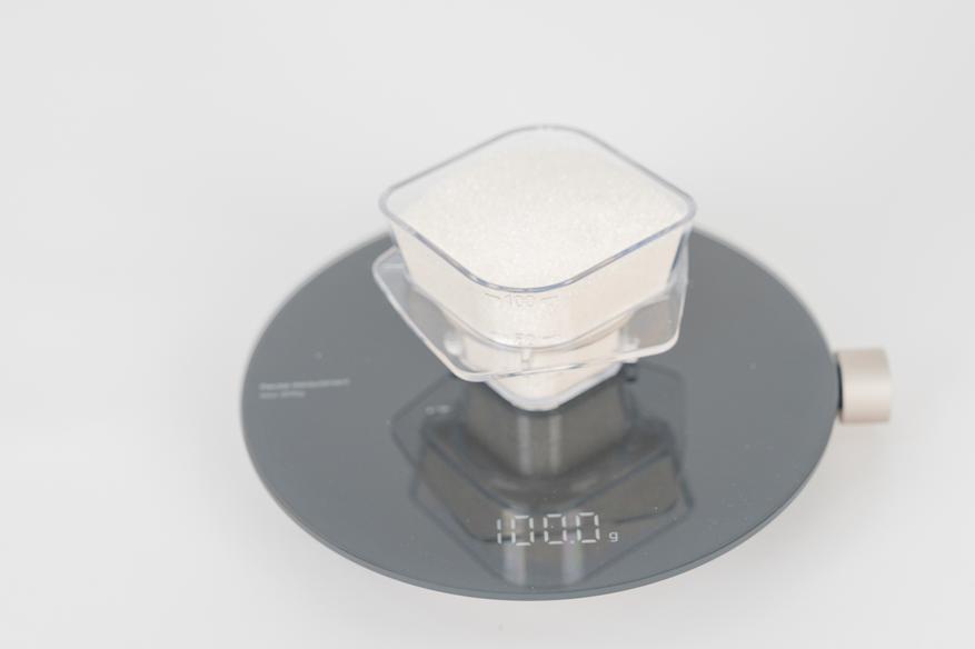 Особое внимание было уделено встроенным весам. Производитель заявляет шаг измерения в 1 грамм, и это подтвердилось на практике: при 100 г сахара прибор показал 99 г;