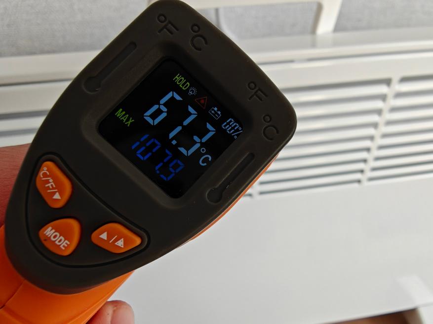 Нагрев воздуха в таком типе обогревателя происходит проверенным методом. Воздух заходит снизу, проходит через крылышки X-образного монолитного нагревателя и выходит в прорези сверху. Такой тип нагревателя хорош тем, что не выжигает кислород и не сжигает пыль. А также он более безопасный, что важно в моем случае, когда рядом будут находиться дети. Корпус обогревателя нагревается примерно до 60°С, а воздух из прорезей не выше 108°С. Ручка прибора не нагрелась выше 44°С, так что могу сказать, что переноска продумана, даже если прибор не охладился.