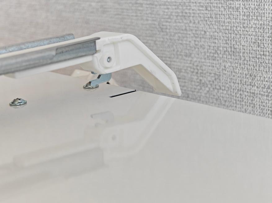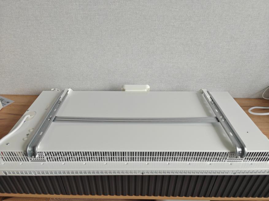 Кронштейн для подвешивания конвектора на стену сразу установлен на заднюю сторону прибор. Нижние зацепы устанавливаются в вырезы для установки ножек, а верхние имеют специальные пружины, потянув за которые, мы можем снять кронштейн. Кронштейн не прогибается при нагрузке, выполнен из качественной стали и толстого пластика.