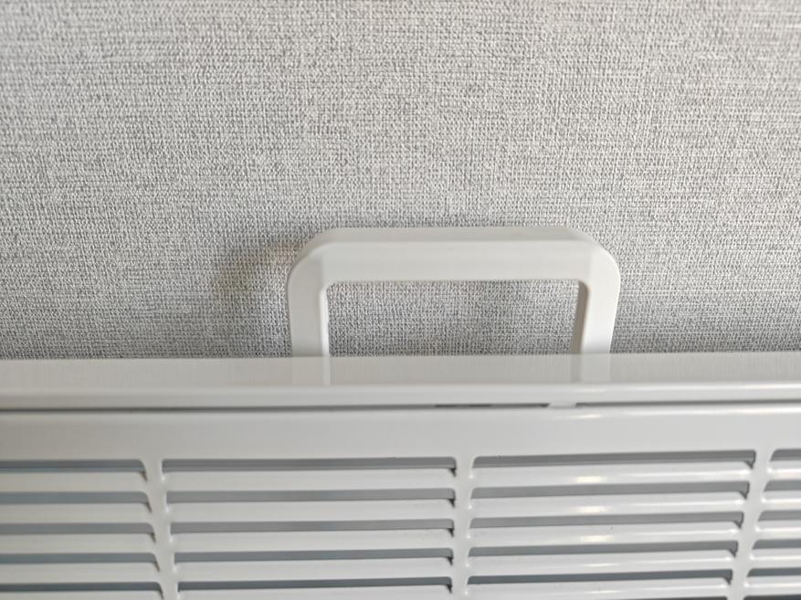 Задняя сторона обогревателя так же из листа металла. При просмотре сзади сразу видим отличительную особенность, которая позволит мне переносить обогреватель из комнаты в комнату. Это пластиковая ручка сверху, сразу установленная на обогревателе.
