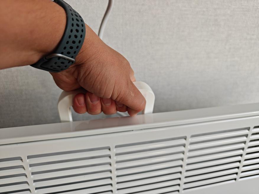Ручка откидывается назад и выполнена из толстого пластика. Переносить не самый легкий обогреватель (около 9 кг) можно будет надежно.