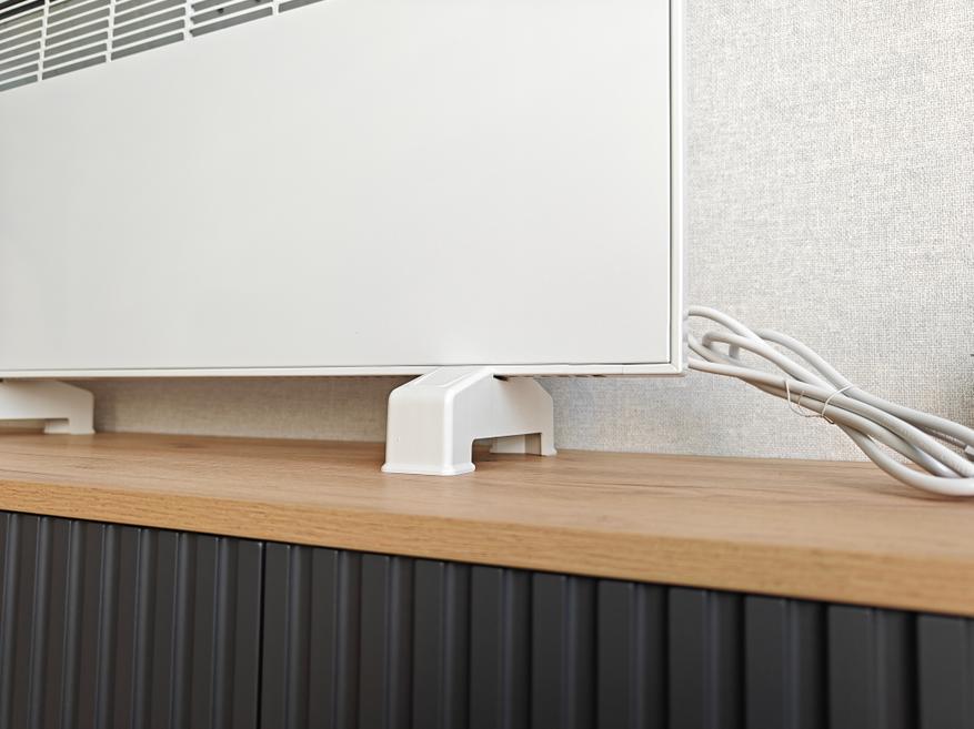 В стандартную комплектацию обогревателя входит: кронштейн для установки на стену, который сразу установлен на прибор, 2 пластиковые ножки, комплект саморезов и дюбелей, а также руководство по эксплуатации и монтажу на русском языке. Стоит отметить, что ножки из пластика массивные, крепкие, совсем не прогибаются даже при значительном усилии. Они значительно шире глубины радиатора для того, чтобы придать ему максимальную устойчивость. Глубина ножек 21 см, высота 10 см, толщина 5 см, толщина пластика 2 мм. Отмечу шикарное качество исполнения пластиковых ножек.