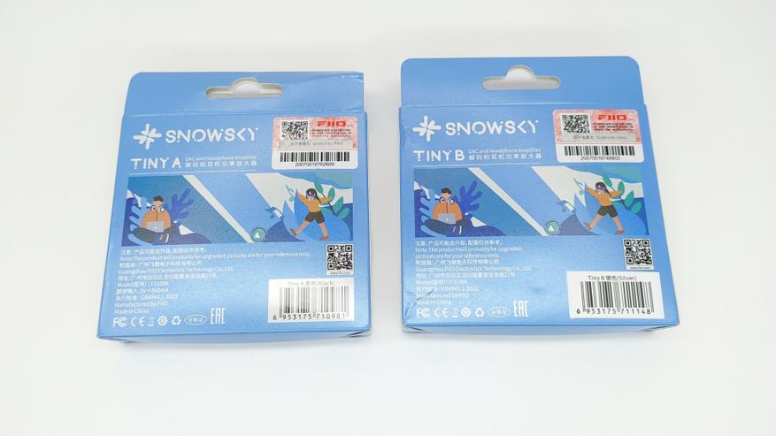 Приходят в коробке из тонкого картона с фирменным фановым оформлением от Snowsky. На передней панели у TINY A есть принт с обозначением цвета девайса, а у TINY B для этого наклейка. Сзади на коробке информация о производителе, а также наклейка проверки оригинальности продукта со стираемым слоем, под которым есть идентификационный код.