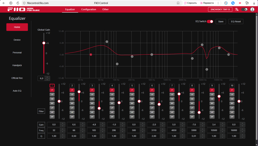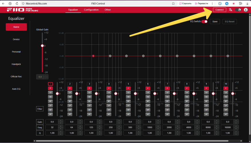 Для настройки EQ можно также воспользоваться и WEB-версией FiiO Control. На странице WEB-версии FiiO Control для начала стоит выбрать английский язык кнопкой в левом верхнем углу, затем через кнопку «Connect», расположенную рядом, подключаемся к вашему TINY, сначала подтвердив выбор подключения в появившемся окне. Для редактирования эквалайзера нужно будет через кнопку «Device» выбрать нужный пользовательский пресет. Сам эквалайзер здесь такой же, только влияние здесь обозначено аббревиатурами.
