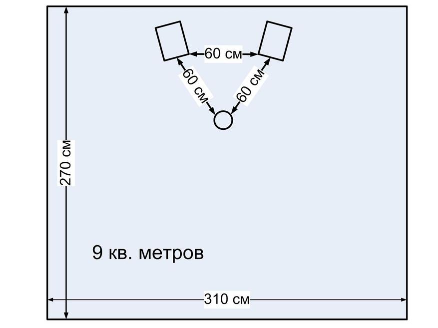 Я сделал запись теста звука, но уже микрофоном Fifine K690 с функцией стерео. Мониторы были расположены на расстоянии друг от друга в 60 см, микрофон также в 60 см от каждой колонки. Получился равносторонний треугольник с длинной стороны 60 см. Такие расстояния примерно соответствуют использованию мониторов с ноутбуком, но в расположении на одной плоскости, без вертикального угла. Мониторы от стены были расположены на расстоянии 10 см. Комната у меня 9 квадратных метров, и в таком помещении AXON 3 отлично раскрываются по низким частотам. Комната немного подготовлена. Всего на стенах 6 квадратных метров акустического поролона и по углам пара не очень эффективных басовых ловушек. Схема расположения мониторов и микрофона сделана в масштабе, и все расстояния на схеме соответствуют реальным.
