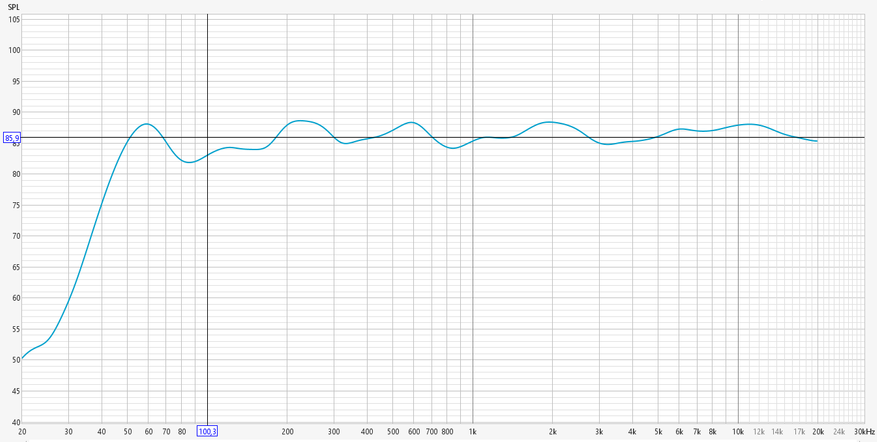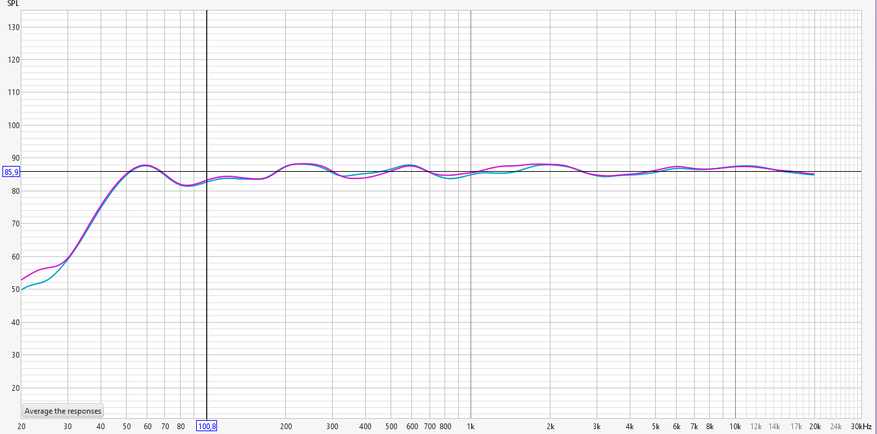 В условиях моей небольшой комнаты всего на 9 квадратов, на расстоянии задней части колонок от стены в 50 см и расстоянием в 80 см от излучателей до измерительного микрофона Behringer ECM8000, замер показывают линейность +/- 3 дБ где-то на 48 Гц. Вот что значит акустика помещения. Обратите внимание, что горизонтальный масштаб с замером одной колонки больше, чем у графика для левой и правой. Я специально сделал для второго графика масштаб поменьше, как делают производители для своих маркетинговых графиков, чтобы подчеркнуть линейность.