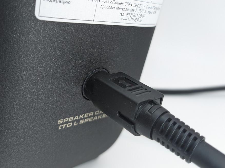 В разъем колонки штекер садится плотно и цепляется еще двумя скобками по бокам цилиндрического контакта. Корпус штекера сделан так, что не ошибешься, как вставлять, а еще он немного подпружиненный, и когда тянешь за него, чтобы вынуть из разъема колонки, то он оттягивается немного назад и прижимает скобки, чтобы легче было вынимать, а потом возвращается на место. Производитель нигде не указал, как точно называется этот кабель, и отмечает его как «4-контактный стереофонический соединительный кабель». Если кто знает, что это за разъем, напишите, пожалуйста, в комментариях.