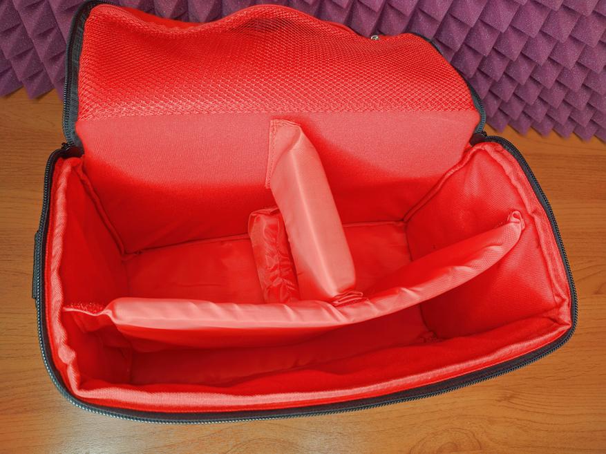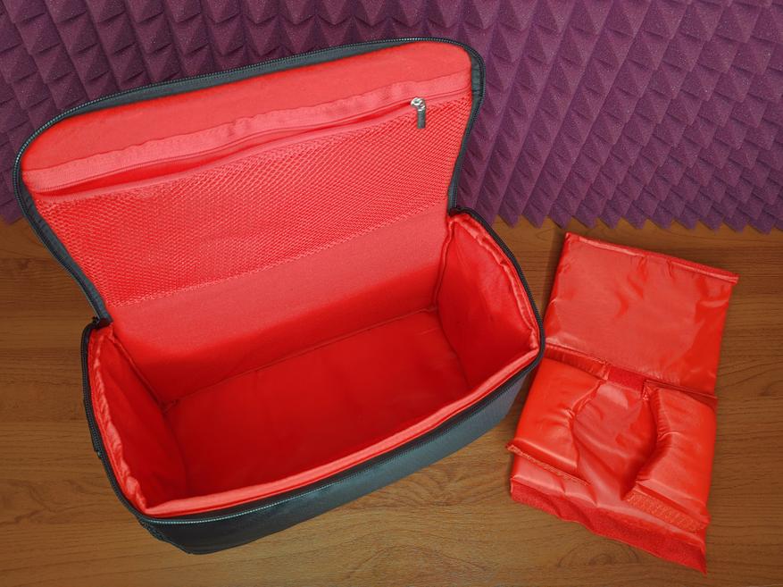 Стенки и крышка сумки толстые, с наполнителем, как мне на ощупь показалось, из вспененного полиэтилена толщиной примерно 8 мм. Точно не поролон. Внутренние перегородки тоже мягко-плотные, они крепятся на липучках. При желании их можно вообще убрать.