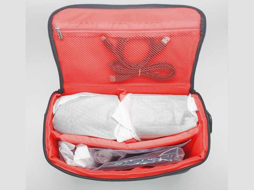 В комплекте идет классная сумка, в которую все и уложено. Молния с двумя собачками, удобно открывать. По бокам два сетчатых кармашка, один сетчатый кармашек на молнии на внутренней части «крышки». Есть крепления для ремня, и сам ремень также лежал внутри.