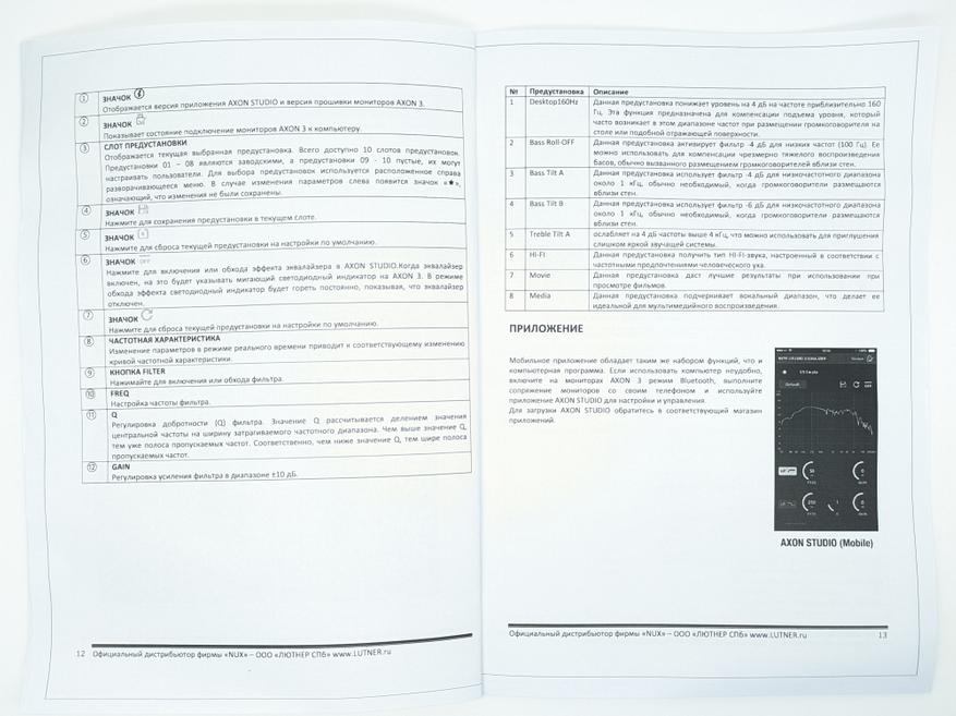 По традиции девайс изучается методом тыка, а инструкцию открываем, если что-то пошло не так. С AXON 3 в целом всё интуитивно понятно, но инструкция в комплекте есть. Правда, судя по приклеенной к левой колонке этикетке, у меня дилерская версия мониторов, и, возможно, это они добавили инструкцию. Это распечатанная версия инструкции с официального сайта, и она действительно очень подробная.
