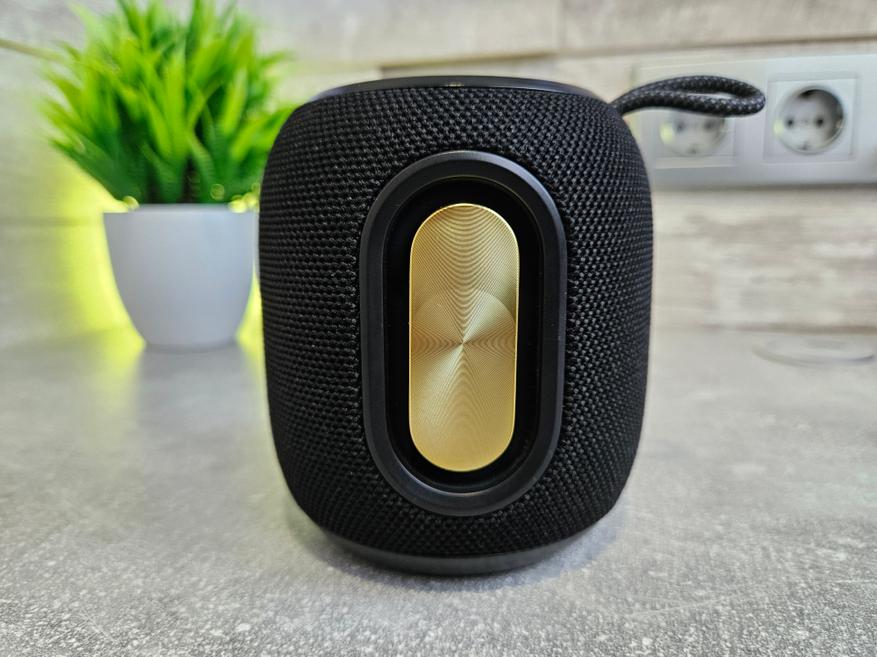 Основная часть колонки покрыта тканью. На лицевой стороне из прорезиненных пластиковых букв исполнено название бреда Tronsmart. Симметрично по бокам расположены два пассивных излучателя. Причем в их покраске используется золотой цвет, который больше нигде в дизайне колонки не задействован.